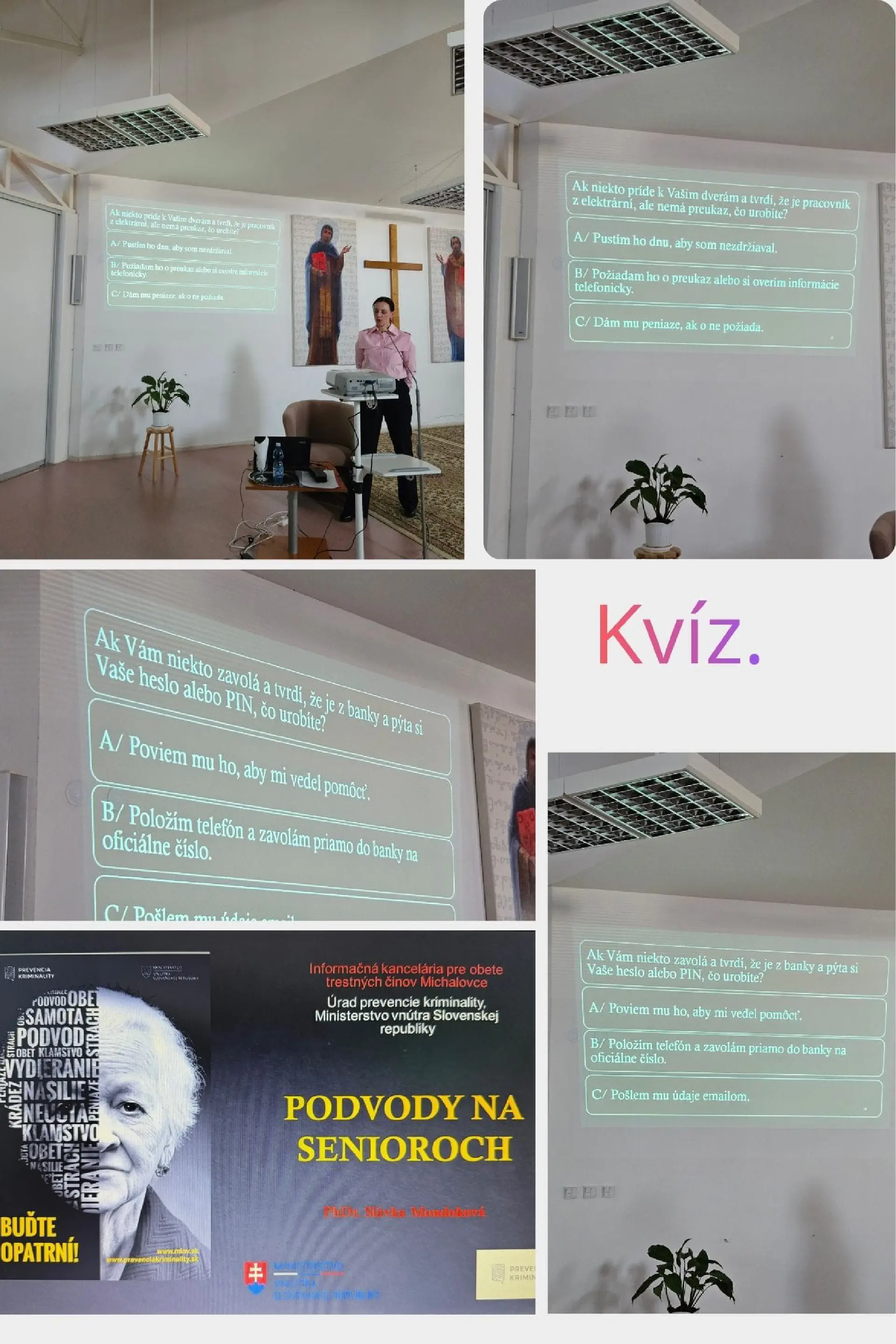 Cieľom prednášky bolo zvýšiť informovanosť klientov o online podvodoch a posilniť ich schopnosť rozpoznávať rizikové situácie. Účastníci prednášky sa oboznámili s najčastejšími formami internetových, SMS a telefonických podvodov, ako aj s preventívnymi opatreniami. Dôraz bol kladený na rozvoj praktických zručností, pričom prednáška bola doplnená o modelové situácie, video ukážky a záverečný kvíz na overenie vedomostí. Klienti zároveň získali konkrétne odporúčania, ako reagovať v prípade podobných situácií v online prostredí.